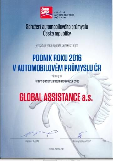 Generální ředitel společnosti Ing. Marek Jaroš přebíral cenu a diplom za výsledky, které jsme na GLOBAL ASSISTANCE a.s. v minulém roku vytvořili. Mimo jiné byla kritériem přidaná hodnota na pracovníka a celkový hospodářský výsledek společnosti. Slovy generálního ředitele "Opět se nám podařilo kontinuálně pokračovat v nastaveném trendu zlepšování kvality, ale i počtu asistenčních služeb pro zákazníky smluvních pojišťoven a pro třetí strany společně se vzrůstajícím počtem nových typů zajišťovaných služeb. Všichni zaměstnanci tak mohou být hrdi na to, že GLOBAL ASSISTANCE a.s. je lídrem v rozšiřování poskytovaných služeb a rozsahu činností pro koncové uživatele."