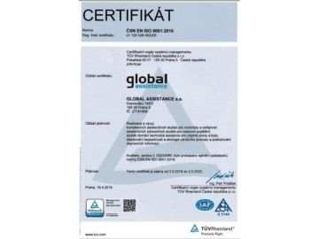 Dne 8. a 9. dubna 2019 proběhl ve společnosti GOBAL ASSISTANCE a.s. audit používaného systému řízení jakosti a kontrola nastavení a uplatňování procesů podle norem ISO 9001:2016. Audit provedla renomovaná společnost TüV Rheinland ČR.