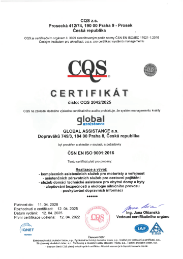 Společnost GLOBAL ASSISTANCE a.s. udržuje a rozvíjí systém řízení jakosti procesů uvnitř firmy i vůči partnerům.