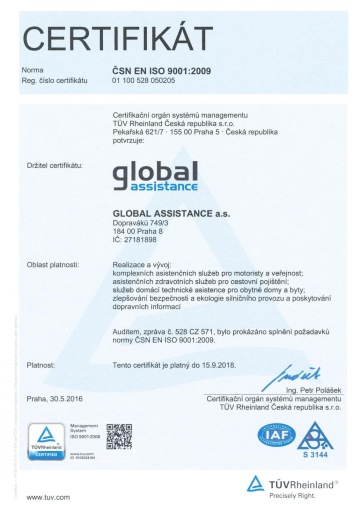 Systém byl po zkušební provozní době v dubnu 2004 roku certifikován renomovanou zahraniční firmou TÜV Rheinland podle normy EN ISO 9001:2009.